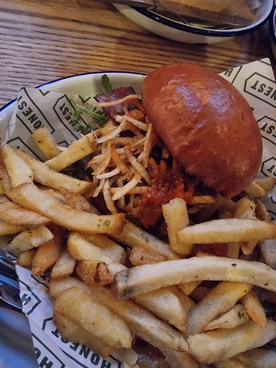 “Finally had the chance to try the honest lunch, had a single smash butger with chips and a coke. Honestly great is all I have to say, I’m glad to have a new lunch spot if the food continues to be as good as I just got it. Burger tastes delicious and the chips are seasoned well and given in a large portion size. All for 9£ with a drink… I was asked about apparently a new thing of adding chips to a seperate bag instead of the burger box - I think it’s a great idea as the chips were still warm and crispy after a 10min walk home, not soggy and wet like they are from other places that add everything to the same box. Great place, great food, please keep the lunch deal on :D”