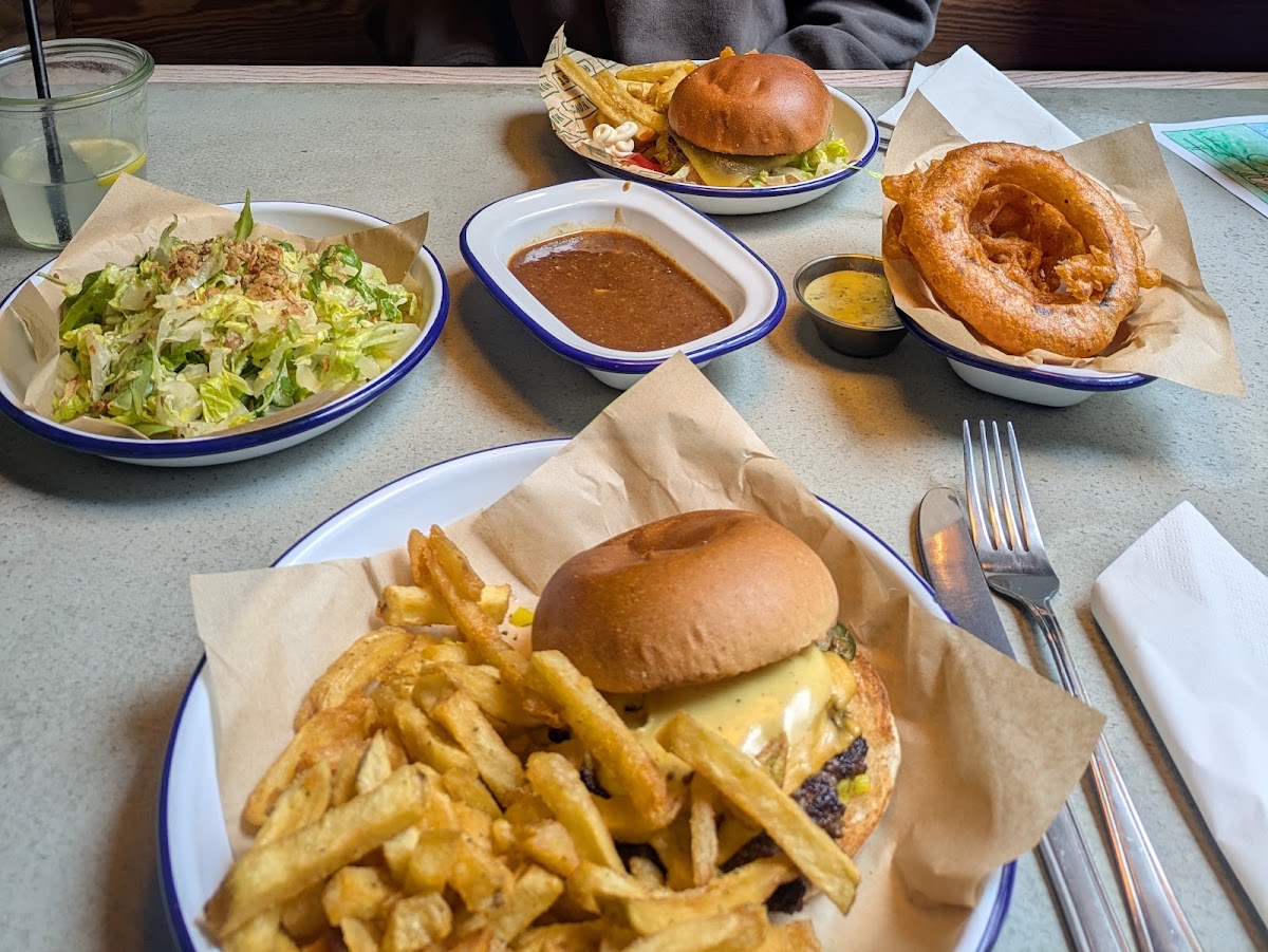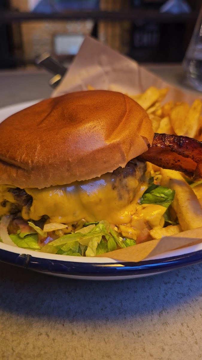 “Not too busy on a Tuesday, friendly service and a clean restaurant. Ordered a double Tribute Burger. Really good textured patties, American cheese and yellow mustard, good bacon, white onion and great pickles. Shredded lettuce. Weird accounting on the bill, attached. Really good skin-on chips, which like the burger patties could have used more salt, absent from the table. Overall a really good experience and solid burger. Only thing which let it down was the indifferent, pedestrian bun.”